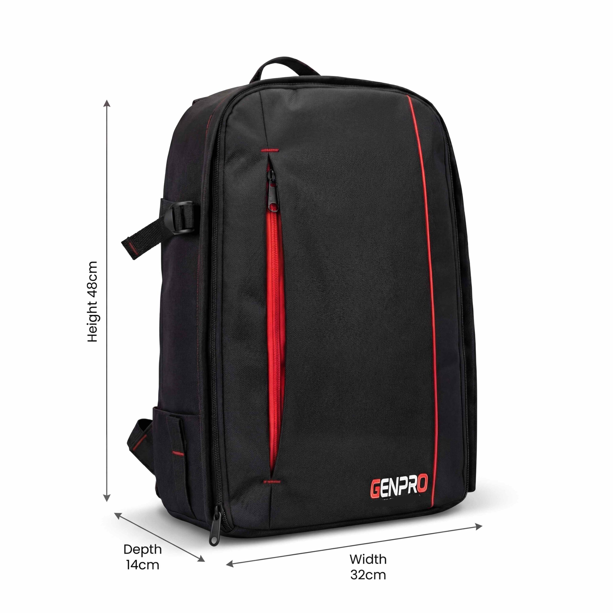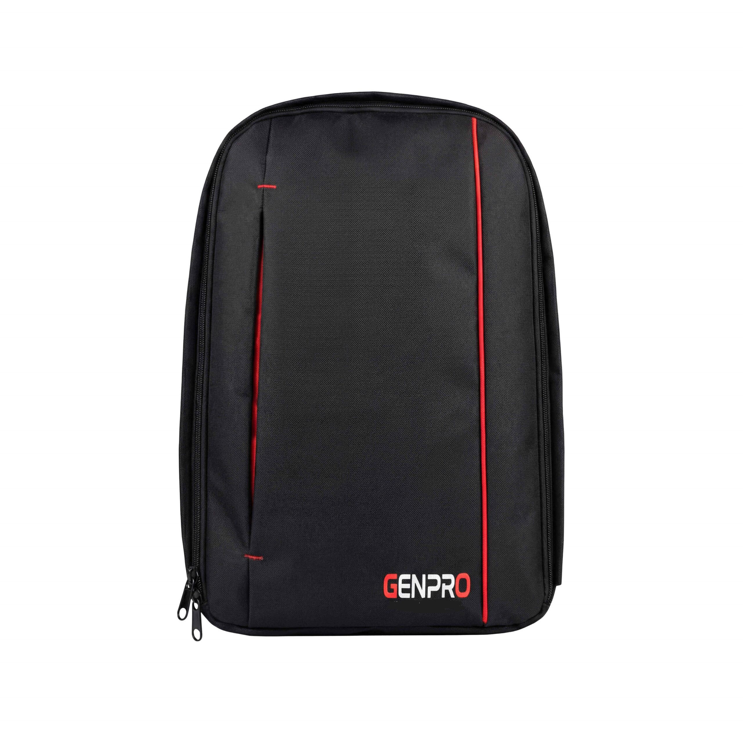 A medium-sized camera backpack from GenPro, made of durable water-resistant polyester, designed to safely carry DSLR/mirrorless cameras, lenses, and accessories with organization.