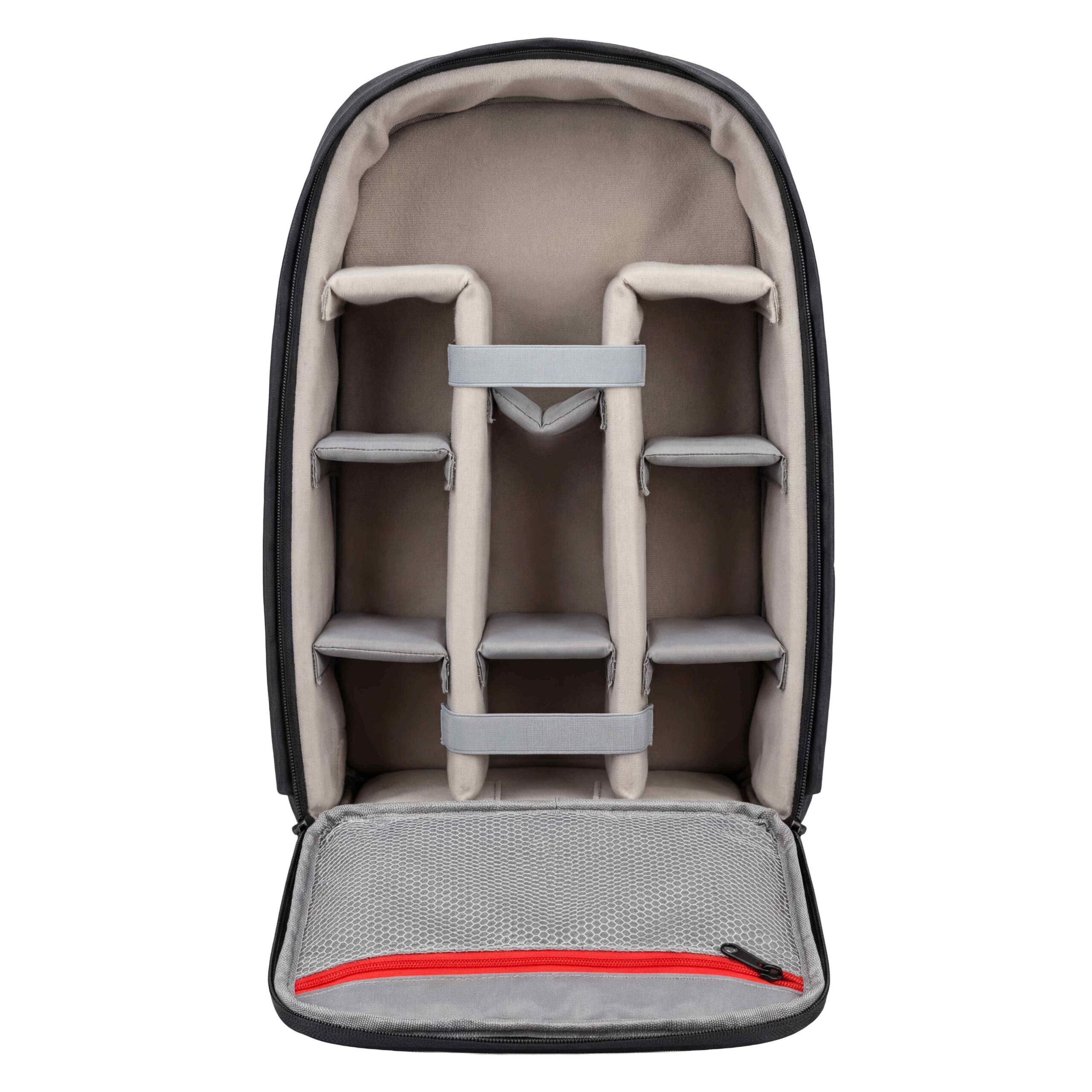 Features an interior with adjustable padded dividers for customizable storage, plus a front mesh pocket for small items like cables or batteries.