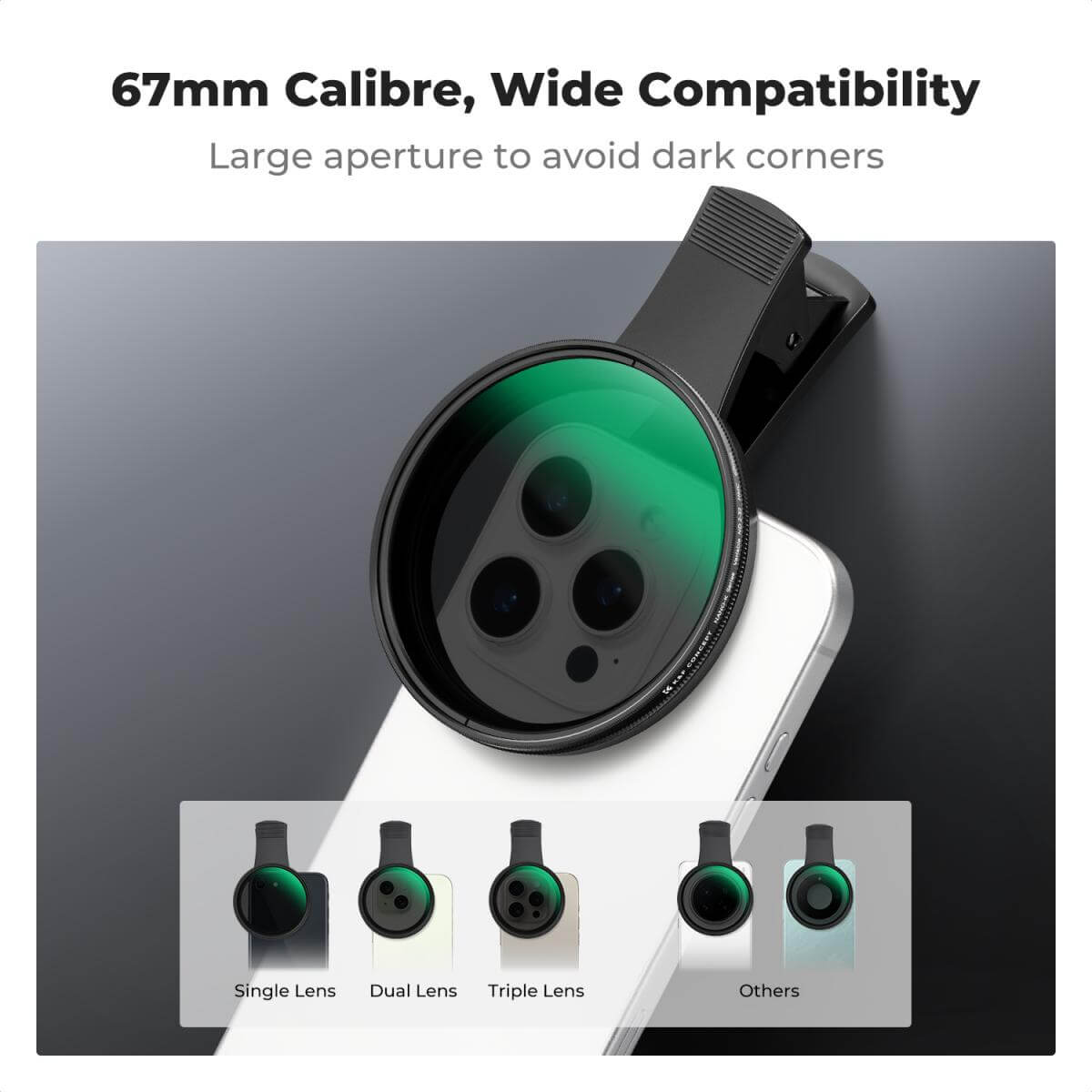 Compatible with most smartphones including iPhone 15 / 14 / 13 / 12 / 11 series and Galaxy S22/S23 Ultra. Works with any 67mm magnetic filter (CPL, ND, UV, diffusion, starburst, GND, and more).