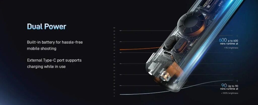 Equipped with a 2000mAh rechargeable battery, providing up to 2–3 hours of continuous lighting on a single charge.